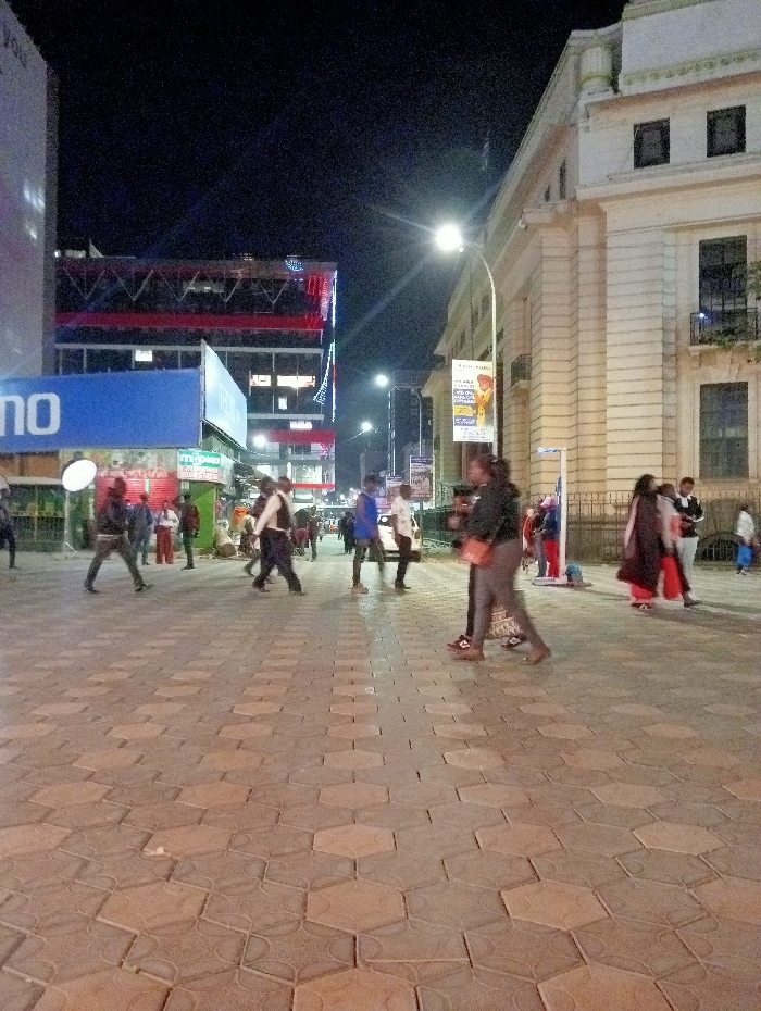 The image depicts a nighttime scene on a pedestrianized thoroughfare in Nairobi, Kenya