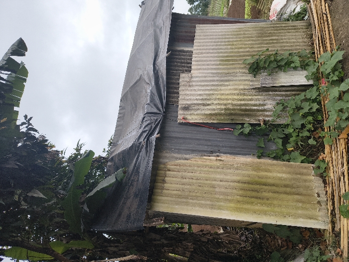 The image portrays a rudimentary structure situated in An Khe Ward, Vietnam, beneath an overcast sky. The structure's walls are composed of weathered, vertically oriented corrugated panels, including both metal and what appears to be fiber cement sheets exhibiting greenish biological growth. A dark, possibly wet, tarpaulin or thick plastic sheeting serves as the roof. A large tree, likely a banana tree, with prominent broad leaves, partially obscures the structure on the left side. Green vines and other vegetation grow densely at the base of the structure. In the immediate foreground, a collection of long, thin wooden or bamboo poles rests horizontally on the ground. A red cord or strap is visible hanging on the right side of the structure's wall. Beyond the structure, to the right, a cultivated agricultural field is visible, showing organized rows of green plants and tilled earth, with some white plastic material in the further distance. No individuals are present in the scene, and no explicit actions or interactions are depicted.
