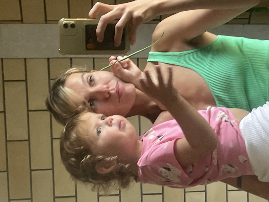 This mirror selfie, taken indoors in Supsekh, Russia, depicts an adult female holding a young child. The adult female, possessing short, light-colored hair and wearing a mint-green ribbed one-shoulder tank top, holds a gold-colored smartphone with a visible card in its case in her right hand, pointed towards the mirror. A tattoo is partially visible on her left forearm. The child, with curly light brown hair, wears a pink short-sleeved t-shirt with white patterns and white ribbed shorts. The child's right hand holds a thin, green plant stem, which touches the adult's lower facial area. Both individuals' gazes are directed generally towards the camera's perspective. The reflected background reveals light-colored, rectangular tiles arranged in a horizontal brick pattern.