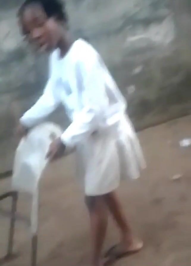 A young Black child in a white long-sleeved shirt and light-colored skirt or shorts moves a lightweight metal chair with a torn white seat. The child wears dark sandals and stands on a dirt or sandy surface near a textured wall. The child moves the chair in a small circle. The camera appears to be handheld.