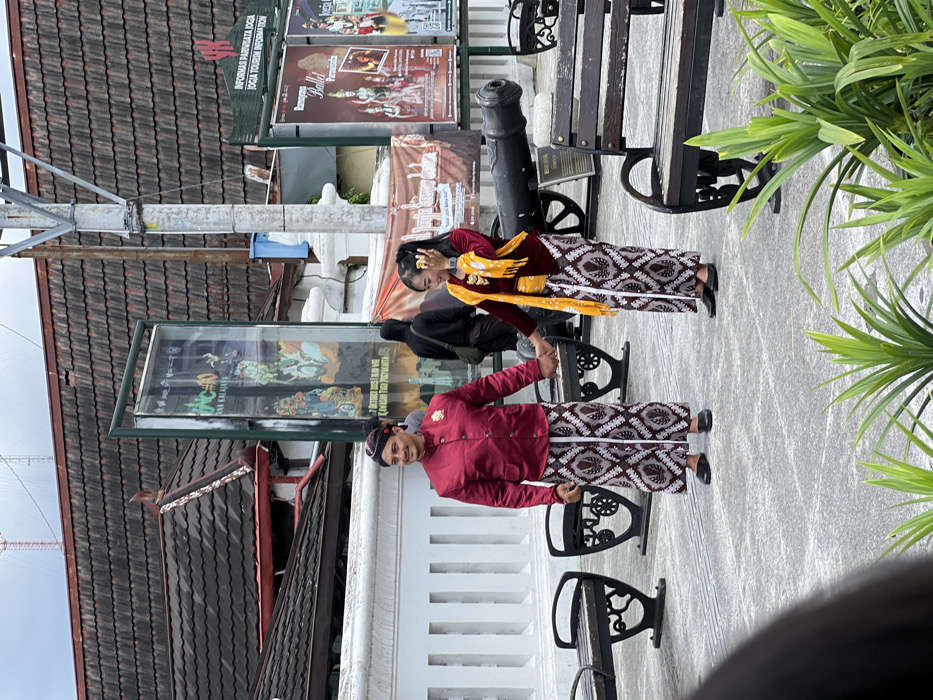 A man and woman in traditional Indonesian attire pose beside a bench and cannon. The man wears a red jacket and a traditional headpiece, while the woman sports a reddish-brown top and a yellow sash. Both wear similar patterned batik sarongs. Informational posters line the wall in the background, and plants appear on the right.