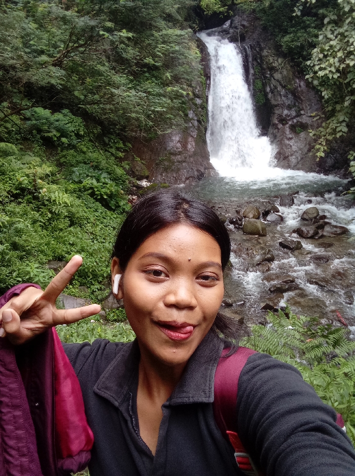 young woman standing in front of a waterfall in the Grojogan Sewu waterfall area, located in the Tawangmangu District of Karanganyar Regency in Central Java, Indonesia. The woman has dark hair and is wearing a black jacket with a red stripe on the strap of her backpack. She is holding up two fingers in a peace sign gesture and is smiling at the camera. Her tongue is sticking out. The waterfall is in the background, cascading down a rocky cliff face. The area around the waterfall is lush and green with trees and foliage. There is also a stream of water flowing in the foreground, along with rocks and vegetation. The coordinates indicate a location near the base of the waterfall. The image is a selfie taken from a close-up perspective. It is likely taken by the woman herself. The overall impression is one of a pleasant, carefree moment in nature.