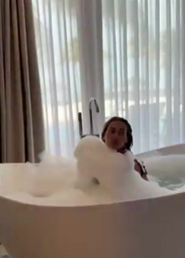 A young woman relaxes in a luxurious white bathtub filled with thick, white bubbles
