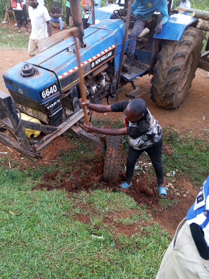 - "A young person is using a sledgehammer to drive a stake into the ground near the front wheel of a blue New Holland Ford tractor" by FM-ybuqj2, licensed under CC BY 4.0