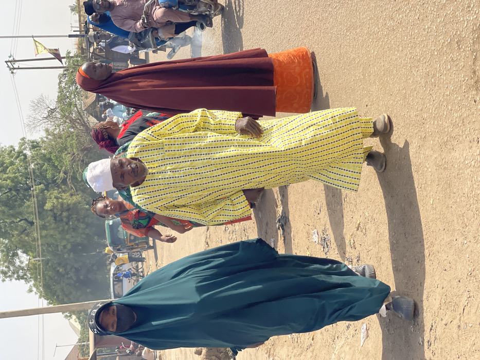 The image depicts an outdoor street scene in Chikaji, Nigeria, under bright daylight. In the foreground, three individuals are walking. On the left, a person wearing a dark teal abaya, a black face mask, and a black baseball cap with white "STAR" lettering walks towards the left, with dark shoes visible. Centrally positioned, an elderly man in a long-sleeved yellow garment with black vertical stripes and a white cap walks towards the right, his right hand slightly raised, wearing light brown shoes. To the right of the elderly man, another person is partially visible, clad in a dark red head covering over an orange patterned dress, also walking towards the right. In the mid-ground, a woman in a patterned top is visible behind the elderly man, looking left. Further back, a green auto-rickshaw is parked on the left side of the dirt road, while multiple individuals, some riding motorcycles or scooters emitting exhaust smoke, are present on the right side of the road. The environment includes a dry, light brown dirt road surface, utility poles with wires, sparse trees, and low-rise buildings or structures in the background. Strong sunlight illuminates the scene, casting distinct shadows.