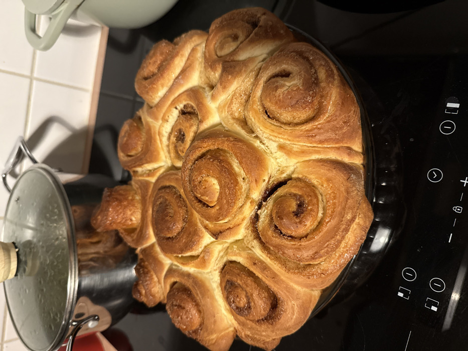 - "Golden brown cinnamon rolls are baked in a round glass pan, arranged in a circular cluster" by FM-o3Fqy2, licensed under CC BY 4.0