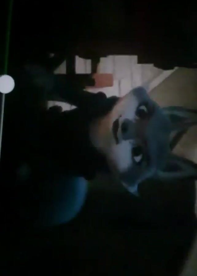 two cartoon characters: a panda and a wolf. The video is presented at a severe angle, with the cartoon characters appearing upside down. The panda is on the left, and the wolf is on the right. The background is dark and blurry. There is a faint green vertical line with a white circle on the left. The bottom of the screen shows some other objects, but they are unclear.