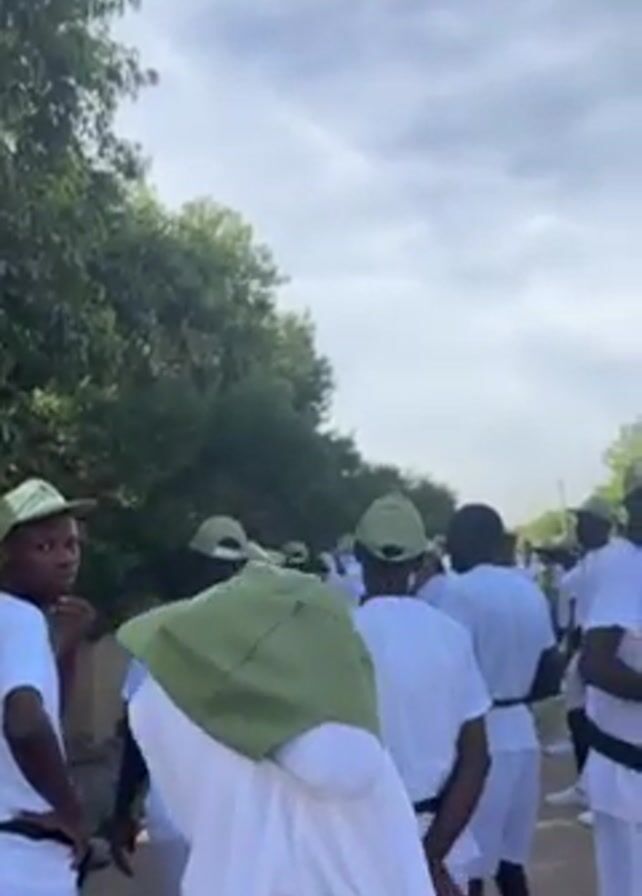 A group of people, likely young men, are standing together in a line on a road. They are all wearing matching white shirts and shorts, and green hats, possibly uniforms. They have black belts around their waists. Some of them have their hands on their hips or clasped behind their backs. The camera is held at a low angle, looking up at the group. To the left of the group is a green, leafy tree. The sky is visible above, with some clouds present. The overall impression is that they are gathered for some sort of event, perhaps military or civic training.