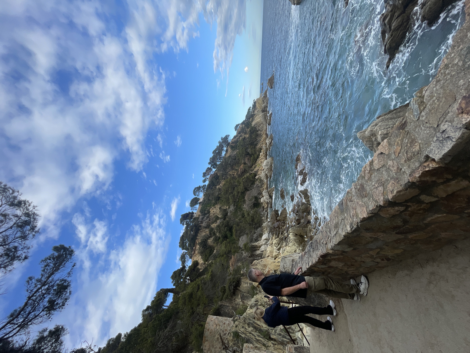 Two individuals are positioned on a paved coastal walkway in Lloret de Mar, Spain, overlooking the Mediterranean Sea. The walkway is bordered by a rough-hewn stone retaining wall, approximately waist-height, separating it from the rocky shoreline and the open sea. To the immediate left of the walkway, a steep hillside densely covered with pine trees and other green vegetation rises. The individual on the right, a male, is dressed in a dark short-sleeved shirt, olive-green cargo pants, and light-colored athletic shoes. He stands with his left hand resting on the stone wall, leaning slightly forward while observing the sea and distant coastline to his right. The individual on the left, a female, wears a dark jacket, dark pants, and white-soled athletic shoes. She is positioned slightly behind and to the left of the male, facing towards the sea. She holds a dark-colored smartphone horizontally with both hands, pointed outwards, consistent with photographing or video recording the scene. The sea exhibits a clear blue-green hue with visible white foam from waves breaking against the numerous large, jagged rocks scattered along the immediate coastline and partially submerged. The sky overhead is bright blue with scattered white cumulus clouds. Pine branches are visible in the upper left portion of the frame, originating from the hillside vegetation. A section of an additional stone structure is visible on the hillside to the left of the path.