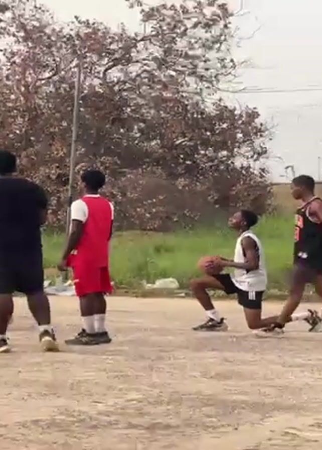 A group of four young men playing basketball on an outdoor court. One of the men, wearing a white tank top and black shorts, kneels on one knee and shoots the basketball towards the hoop. Another man, wearing a red jersey and shorts, stands nearby watching. The other two men are positioned around the court, also observing the shot. The court is surrounded by trees and greenery. The man kneels on one knee to attempt a shot. The ball is a miss.