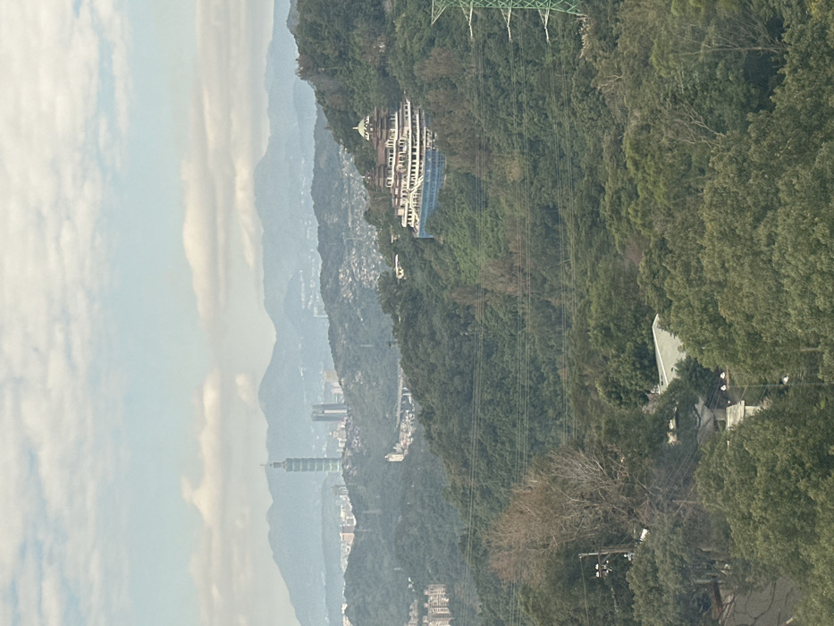 A hazy, vertical landscape displays mountains layered in the distance, merging with the sky. Taipei 101 rises amidst the cityscape. Lush green foliage covers the adjacent slopes. A large, tiered building is visible nestled on the mountainside, with power lines traversing the view. The overall scene evokes a sense of distance and urban integration within a natural environment.