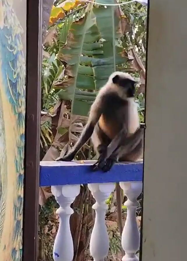 monkey, likely a langur, sitting on a blue and white balcony railing outside a doorway