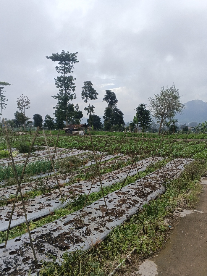 A field of crops stretches under an overcast sky, dotted with trees and a distant mountain. Rows of produce are lined with bamboo supports and covered with perforated plastic sheeting. A small structure with a dark roof sits near the middle ground. A dirt road borders the field in the foreground.