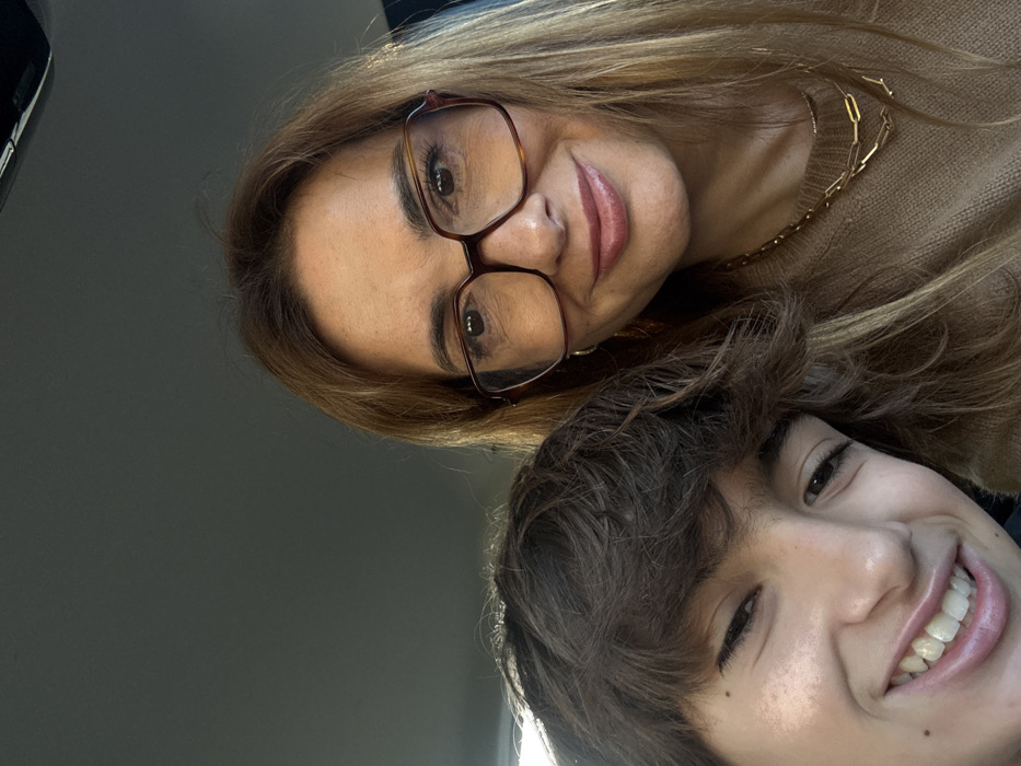The image displays two individuals, an adult female and a male youth, captured in a close-up, selfie-style indoor portrait
