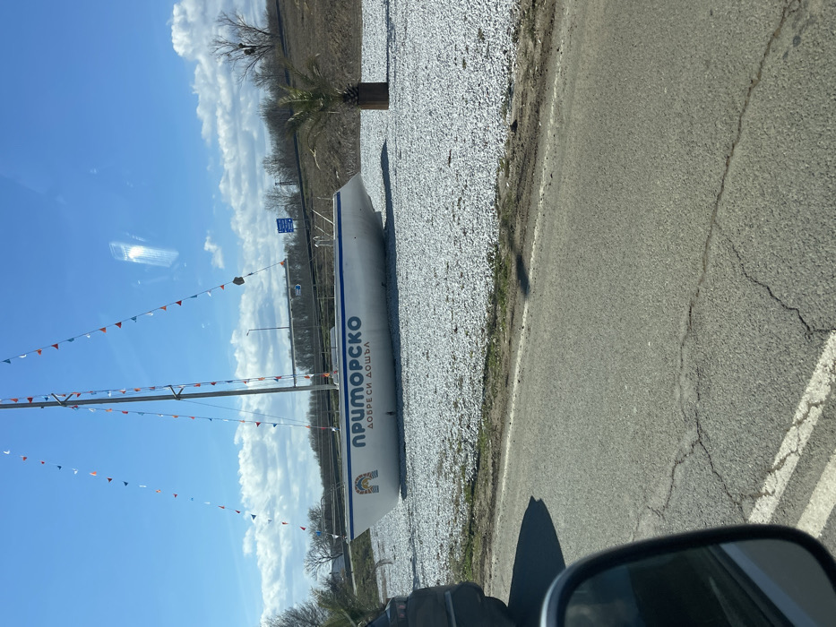 An outdoor, daytime image depicts a prominent white sailboat displayed on a flat expanse of light-colored gravel. The boat, serving as a landmark, features a mast from which multiple strings of colorful triangular pennants are suspended. The hull of the boat is stenciled with blue Cyrillic text, reading "ПРИМОРСКО ДОБРЕ ДОШЪЛ" (Primorsko Welcome), alongside a rainbow graphic on its bow. To the right of the boat, a small palm tree grows within a rectangular wooden planter, also on the gravel surface. The scene is viewed from an asphalt road in the foreground, which exhibits surface cracking and has a white solid line marking its visible edge. A reflection of a vehicle's side mirror is visible in the lower-left corner, indicating the perspective from within a vehicle. A portion of a dark-colored vehicle is visible on the far left, adjacent to the road. In the background, an elevated highway or main road with visible guardrails and a blue directional sign is present, with bare deciduous trees and shrubs lining the distant horizon. The sky is clear blue with scattered white cumulus clouds. This roadside display is located at an approach to the city of Primorsko, Bulgaria. No individuals are present in the image.