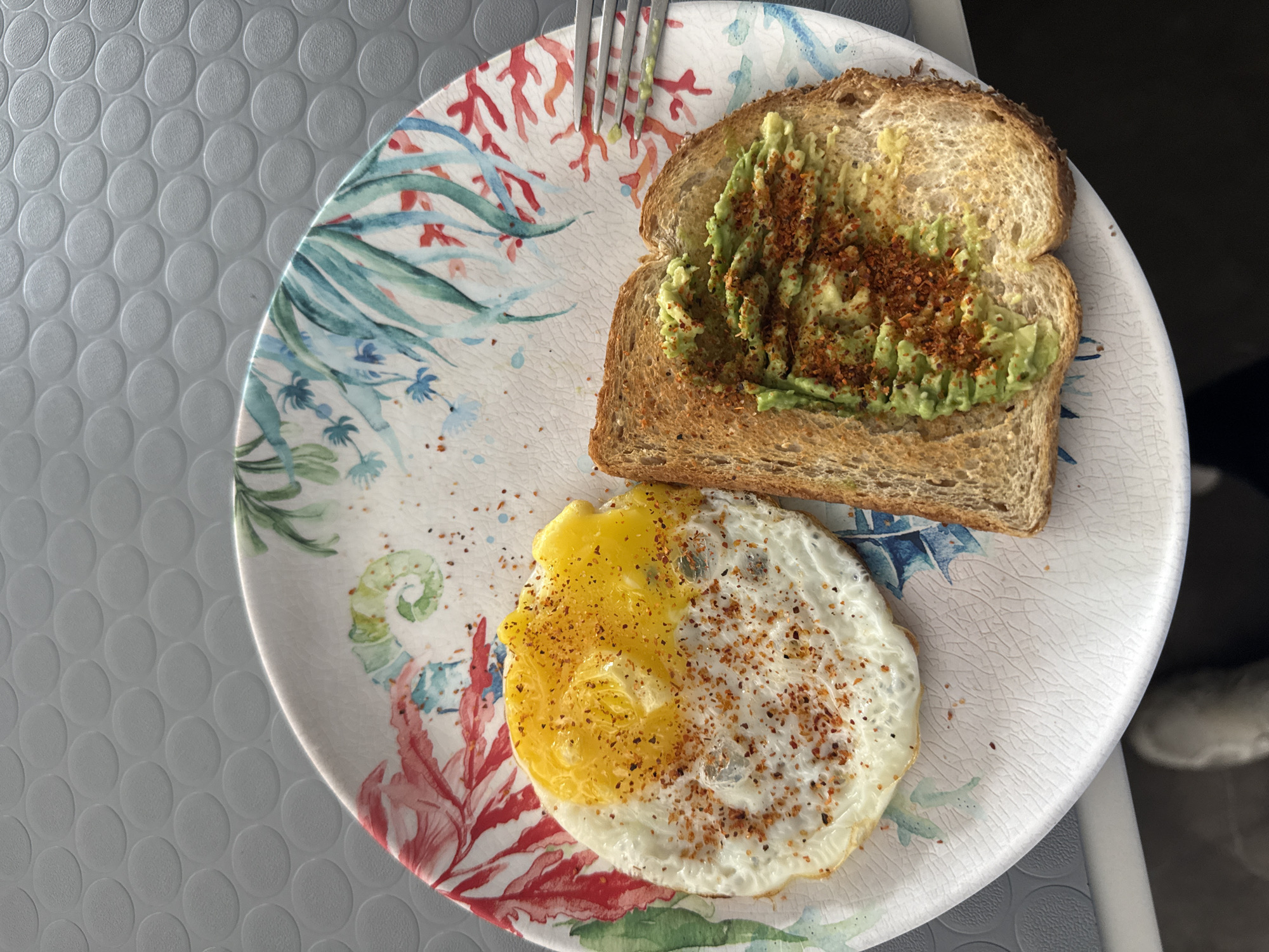 A plate of food sits on a gray, textured surface. The plate has a floral design with coral, blue, and green hues. On the plate is a slice of toast topped with mashed avocado and red pepper flakes. Adjacent to the toast is a fried egg, with a portion of the yolk still runny and dusted with spices. A fork rests on the plate, near the toast. The scene is indoors. It is difficult to determine if the location is San Bernardino Tlaxcalancingo, Mexico from the image. There are no people visible.