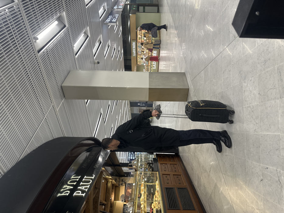 The image depicts an interior scene within Orly Airport, located in Paray-Vieille-Poste, France, characterized by commercial establishments and individuals. The flooring consists of large, polished light-grey marble-patterned tiles reflecting overhead light. The ceiling is a white grid system with numerous rectangular fluorescent light fixtures. In the left foreground, a male individual, likely mid-adult, stands in profile facing left. He is dressed in a dark, long-sleeved jacket, dark trousers, and dark shoes. A dark backpack is visible on his left shoulder. His right hand holds the extended handle of a black, soft-sided rolling suitcase with gold-colored zipper accents. The man's head is turned sharply left, observing the display of a "PAUL" bakery. The "PAUL" bakery counter, positioned curvilinearly, features a dark exterior with illuminated white lettering. Below this, glass display cases showcase various baked goods, pastries, and sandwiches. The counter's lower portion is dark wood paneling with decorative drawer fronts. A staff member wearing a cap is partially visible behind the counter. In the midground, a prominent rectangular pillar extends from floor to ceiling, divided into a lighter beige upper section and a darker beige-grey lower section. Further to the right, behind this pillar, another retail establishment identified as "LADUREE" is visible, featuring glass display cases and a light facade. Several individuals are present near Ladurée: two women, one in a red skirt, are observed near the shop's display, and a man in a dark coat is seen further right. Overhead, dark informational signs with white text, including "DORY T1" and "Only T1" with directional arrows, are suspended. A small security camera is mounted on the ceiling grid to the right of the central pillar. The scene illustrates typical activity within a contemporary airport terminal.