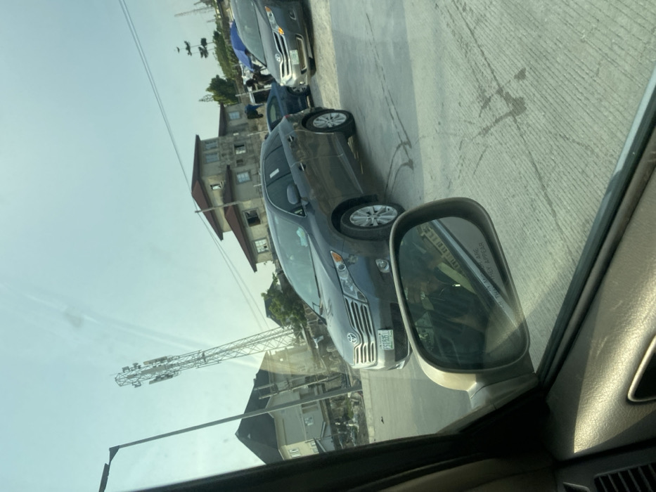 The image displays an outdoor urban environment in Ikate, Nigeria, under a clear, bright sky. The perspective is from within a vehicle, with its beige door frame, window, and side mirror visible in the foreground. The side mirror reflects a person's head and shoulders, clad in a dark shirt, and contains the etched text "OBJECTS IN MIRROR ARE CLOSER THAN THEY APPEAR." The concrete ground ahead exhibits multiple tire marks and darker fluid stains. In the mid-ground, a dark gray Toyota Venza SUV is positioned, facing slightly to the right. It displays a Nigerian license plate, "FST 536 TJ," and a white sticker is affixed to its rear passenger window. Behind this vehicle, a dark blue sedan is partially visible. To the right, another light gray Toyota Venza SUV is stationary, with a blue tarp canopy and indistinct figures visible further behind it. The background includes a tall, metal telecommunications tower, which appears to lean slightly, located between two buildings. A black utility pole or lamppost is partially visible on the far left. On the left, a light-colored building with a dark pitched roof is partially seen. On the right, a two-story building with a reddish-brown pitched roof appears weathered, featuring multiple open window frames. Overhead power lines are discernible across the sky. Minimal green foliage is present near the buildings on the right.