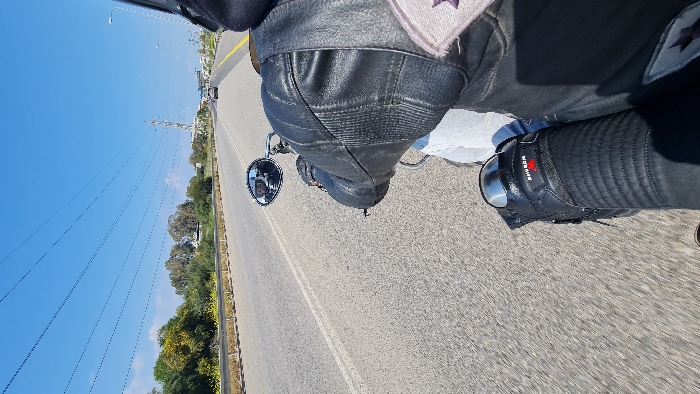 The image depicts a first-person perspective from a motorcycle traveling on a paved road under a clear blue sky in Kiryat Ata, Israel