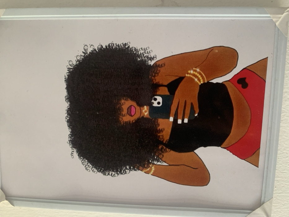 A framed illustration is mounted on a plain white wall in Lekki, Nigeria. The artwork depicts a stylized, dark-skinned female figure from the waist up. The figure has a large, voluminous dark afro hairstyle that fully obscures her eyes. Her mouth is open, revealing pink lips. She wears a black spaghetti strap top and red high-waisted shorts featuring a small black heart emblem on the left hip. Accessories include a gold-colored choker necklace and multiple gold-colored bangles on both wrists. Her visible fingernails are painted white. The figure holds a dark-colored smartphone, identifiable by its dual camera array, in her right hand, positioned to suggest a mirror selfie. The illustration is contained within a light-colored frame, and white corner protectors are visible on the top-left and bottom-left edges of the frame.