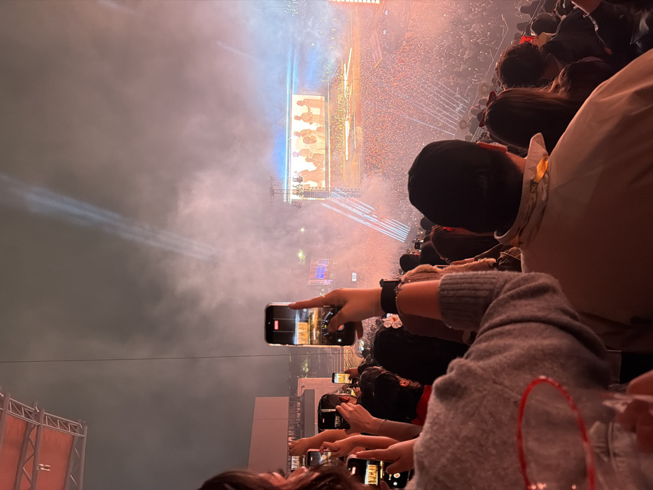 At a concert, an audience captures the stage with their phones. Stage lights illuminate a hazy scene, while beams cut through the smoke. A large crowd extends into the distance, their faces indistinct. Close to the camera, hands hold up phones. A mix of winter garments adorn the attendees, including grey sweaters and brown jackets. A few red objects peek into the frame, possibly cups or decorations.
