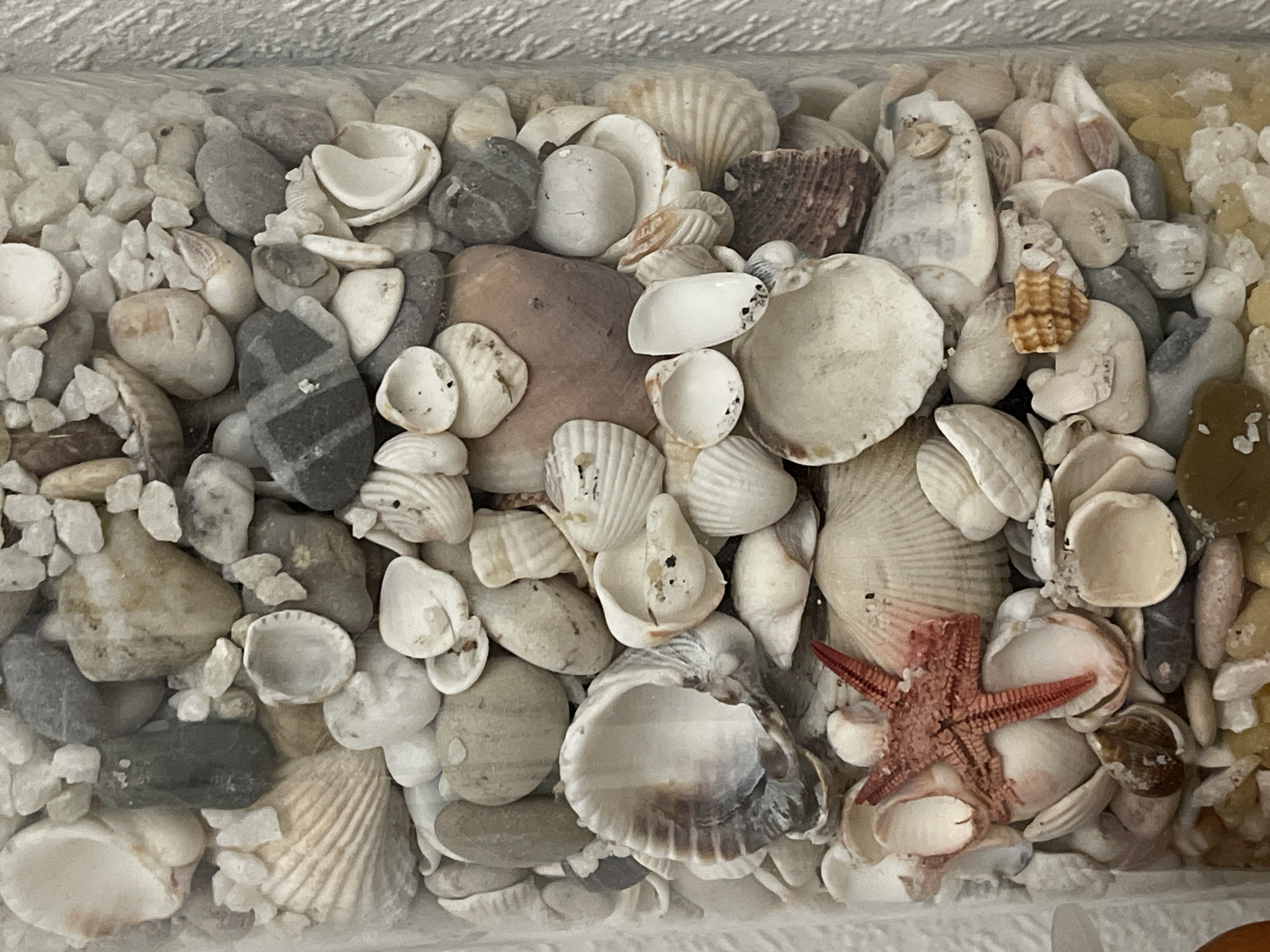 The image displays a vertical close-up of a transparent container, likely glass, filled with a dense collection of marine and coastal debris, situated in Chaikovsky, Russia. The contents consist primarily of numerous seashells, varying in size, shape, and color from off-white and beige to light grey and brown, some whole and others fragmented. Interspersed among the shells are small, smooth pebbles and angular grit, predominantly in grey, white, and tan tones. A prominent feature is a five-armed, red-orange starfish, approximately 7-8 cm in length, positioned in the lower-middle section, resting upon and surrounded by shells. Fine, light-colored sand fills the gaps between the larger objects. The right edge of the container reveals a textured, vertical surface in the background, possibly a light-colored wall or fabric.