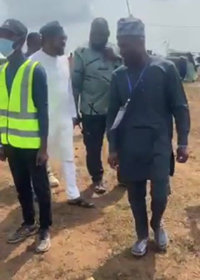 several men walking outdoors across a brown, grassy field. The sky is overcast. A man in the center is dressed in a white, long-sleeved tunic and pants, along with a black hat. He is surrounded by other men in casual attire. One man wears a black and green patterned shirt and black pants. Another wears a gray tunic and dark pants. A person in a high-visibility yellow vest and a face mask is also present. The men appear to be engaged in conversation as they walk. Tents and other structures can be seen in the background.
