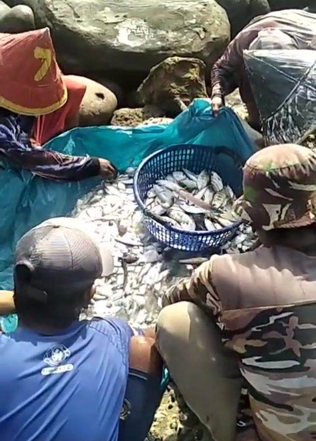 Four people are sitting around a large pile of small, silvery fish that are on top of a light blue tarp. A blue plastic basket, partially filled with more of the fish, is on top of the pile. The people appear to be sorting or handling the fish. The person closest to the camera is wearing a blue shirt and a gray baseball cap. Another person is wearing camouflage clothing and a camouflage bucket hat. A third person has on a red and orange conical hat. The fourth person's clothing is partially obscured. Behind the people and the fish are large rocks. The scene appears to be outdoors and sunny.