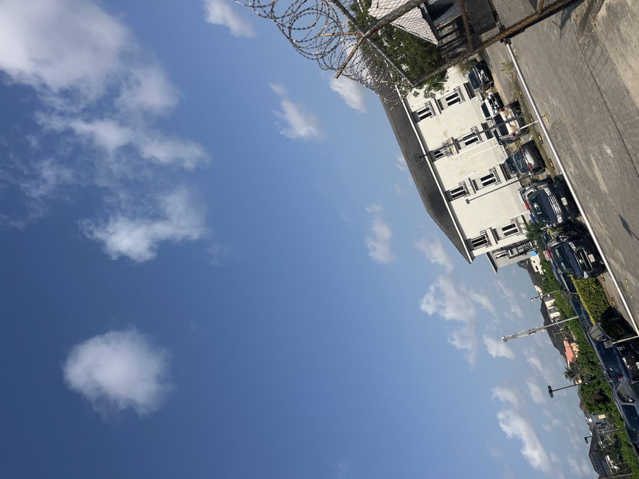The image depicts an outdoor scene in the city of Ojomu, Nigeria, under a bright blue sky with scattered white cumulus clouds. The perspective is tilted slightly, with the horizon line rising from left to right. In the foreground and mid-ground, a paved parking area is visible, containing numerous parked vehicles. Prominently featured are several dark-colored SUVs. At least two of these vehicles, a dark blue/black Toyota Highlander and a dark pickup truck, are equipped with roof-mounted emergency light bars, suggesting they are security or police vehicles. White parking space lines are visible on the asphalt or concrete surface. To the far right, a rusty chain-link fence, topped with rolls of concertina wire, partially frames the scene, indicating a secured perimeter. In the mid-ground and background, a light-colored, multi-story building with a dark, possibly grey, roof is visible behind the parking lot. This building features multiple rectangular windows with dark frames and small balcony-like structures beneath each window. To the left of this building, other residential structures and green vegetation, including trees and shrubs, are present. A tall, slender utility or light pole stands among the parked vehicles on the left. No individuals are visible in the scene. The overall lighting suggests bright daylight conditions.