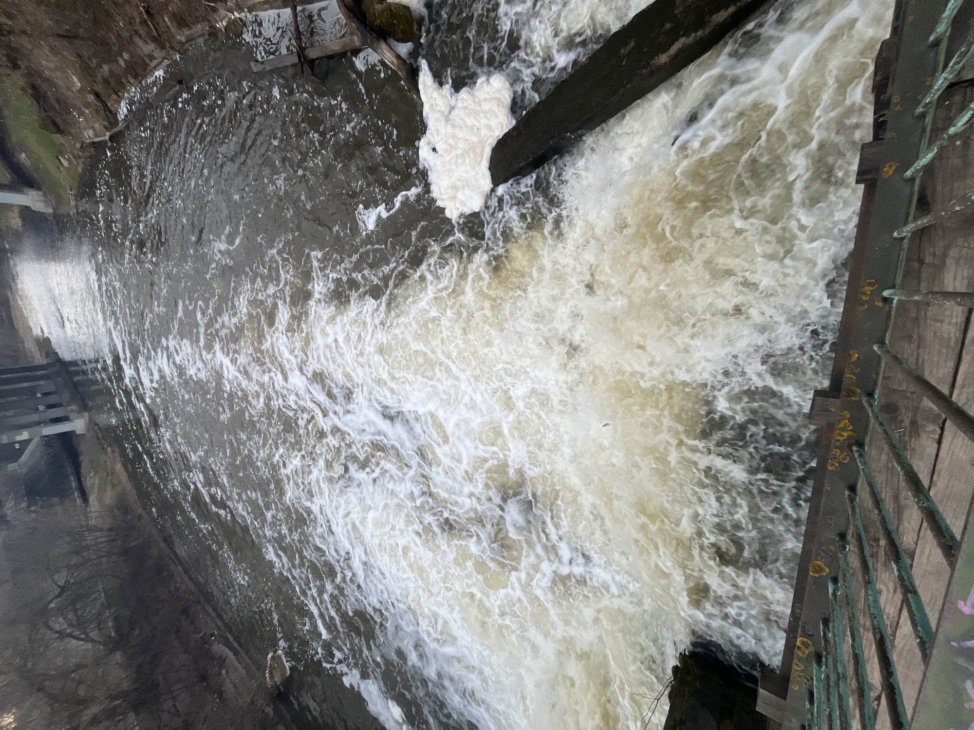 view from a bridge looking down at a waterfall in Klin, Russia. The water is turbulent and foamy, with a dark log partially submerged in the water on the right. A metal railing of the bridge is visible in the foreground on the right. There is a structure on the left that looks like part of the dam system. The weather appears overcast.