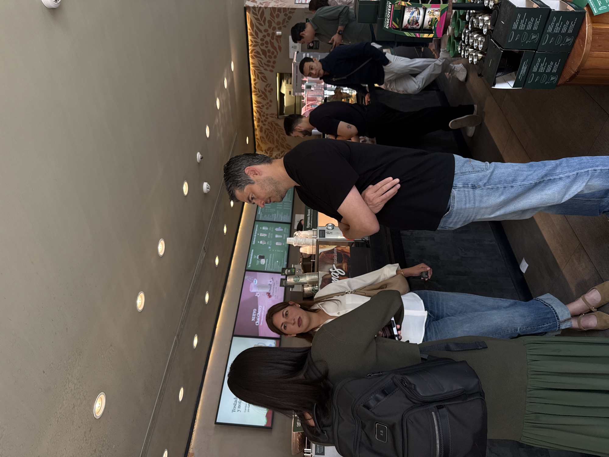 The image captures the interior of a coffee shop, identified as being located in San Agustín, Mexico. The scene features seven individuals engaged in various activities within the establishment. In the foreground, a woman with long dark hair, wearing a dark green long-sleeved top and a matching pleated skirt, is positioned with her back to the viewer, carrying a black backpack monogrammed with "AB." She faces a woman to her right, who has long brown hair, a white collared shirt, cuffed blue jeans, and light brown flat shoes, holding a smartphone. Adjacent to them, a man with short gray hair and a beard, dressed in a black t-shirt and blue jeans, stands with his arms crossed, looking towards the two women. The background reveals a coffee bar counter with multiple digital display screens showing menus and promotions in Spanish, including "NUEVO Chai Cherry." Various coffee-making equipment and serving items are visible on the counter. Further down the counter, several other male patrons are present: one in a black t-shirt with a tattoo on his left arm, another in a dark blue jacket and light pants, both leaning against the counter, and two partially visible men in the rear, one in a green shirt. The ceiling is light-colored, fitted with numerous recessed circular lights and a smoke detector. A decorative wall panel with an earthy-toned floral or vine pattern is visible in the background. On the right side of the foreground, a wooden retail display stand features mugs, some bearing "Mexico" branding, and boxed coffee products. The floor is dark-colored.