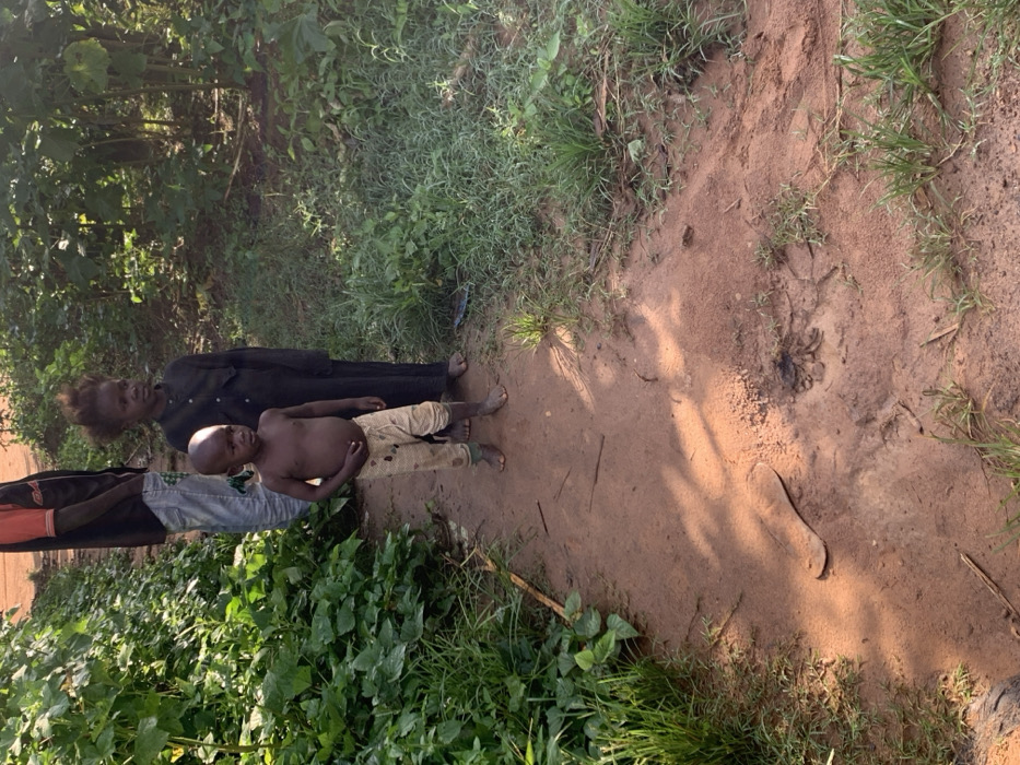 The image depicts an outdoor scene in Kafanchan A, Nigeria, featuring a reddish-brown dirt path flanked by dense green vegetation. Three individuals are present on or immediately adjacent to the path. In the foreground, a barefoot male child, approximately 2-4 years old, with dark skin, stands shirtless wearing light-colored, patterned trousers. His left hand rests on his abdomen, and he faces forward. Directly behind him and slightly to the right stands a barefoot female child, approximately 5-7 years old, with dark skin and textured dark hair, wearing a long-sleeved dark garment. She faces slightly right of the frame. Partially visible in the background, to the left of the children, is the lower torso and legs of an adult male, wearing a black shirt with an orange upper section and faded blue jeans. A single, light-colored sandal sole lies flat on the dirt path in the foreground, beneath the children. Dark, amorphous organic debris is present on the path near the center. Natural sunlight casts distinct shadows across the path from the left.