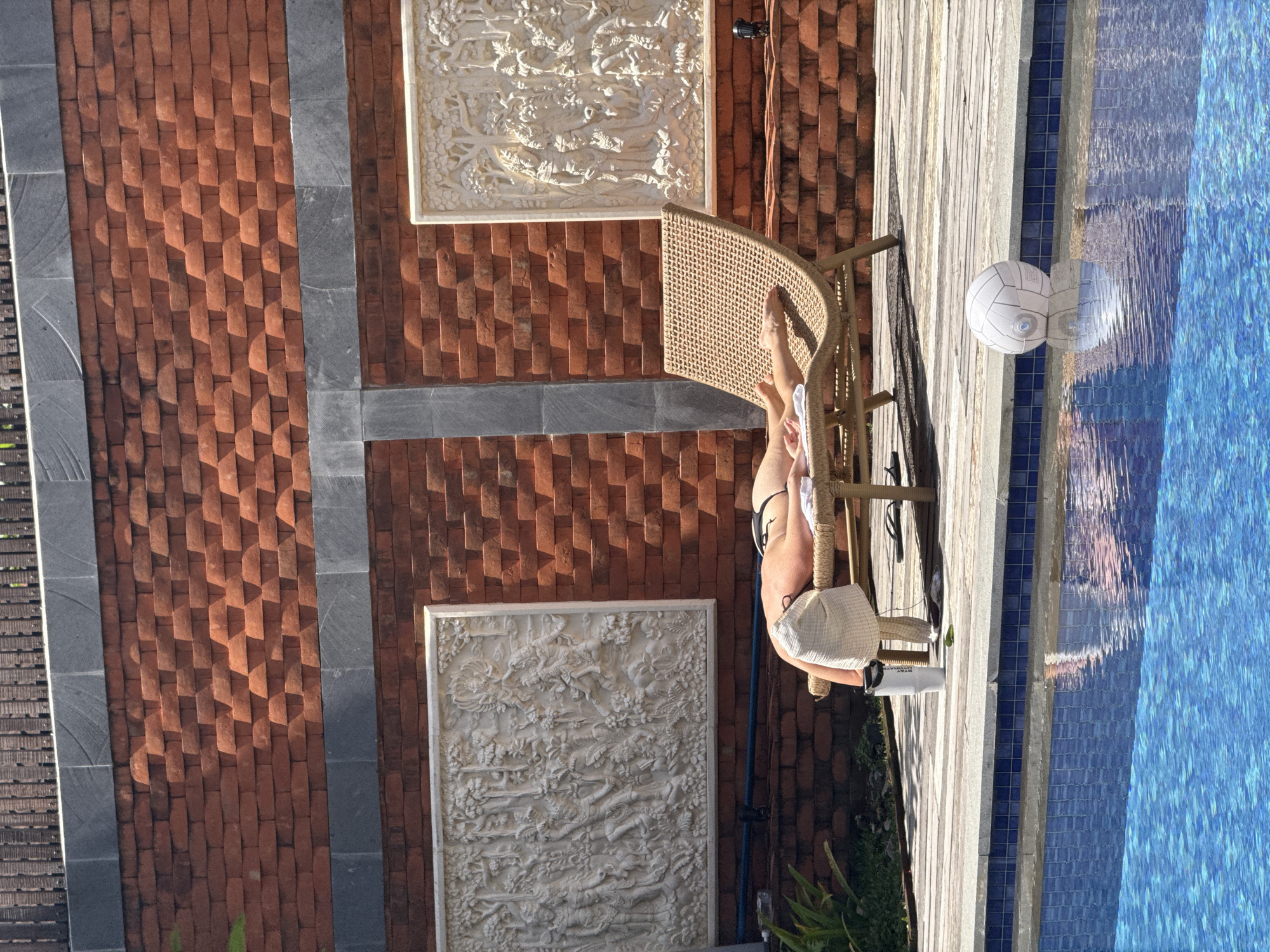 An aerial, eye-level shot captures a scene at a pool in North Kuta, Indonesia. A fair-skinned woman is lounging on a wicker chair near a pool's edge. She is wearing a black bikini and a white hat. A white reusable water bottle sits next to her, on the deck, and a white ball is floating in the pool. The pool is clear blue. The deck is light colored wood and the surrounding area is constructed of brick with two decorative white reliefs on the wall.