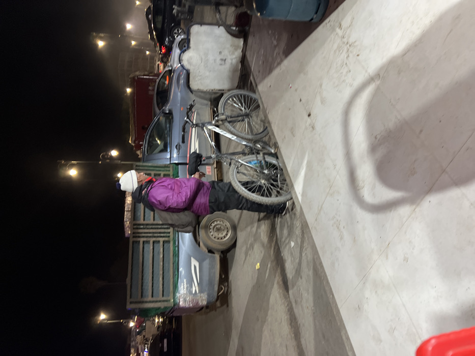 At night, a person in a purple jacket and white hat stands next to a parked truck, a bicycle leaning against the truck's side. Several other vehicles are parked nearby, illuminated by streetlights. The scene is shot from a slightly elevated angle, looking down at the subjects. A tiled or concrete area occupies a significant portion of the right side of the frame.