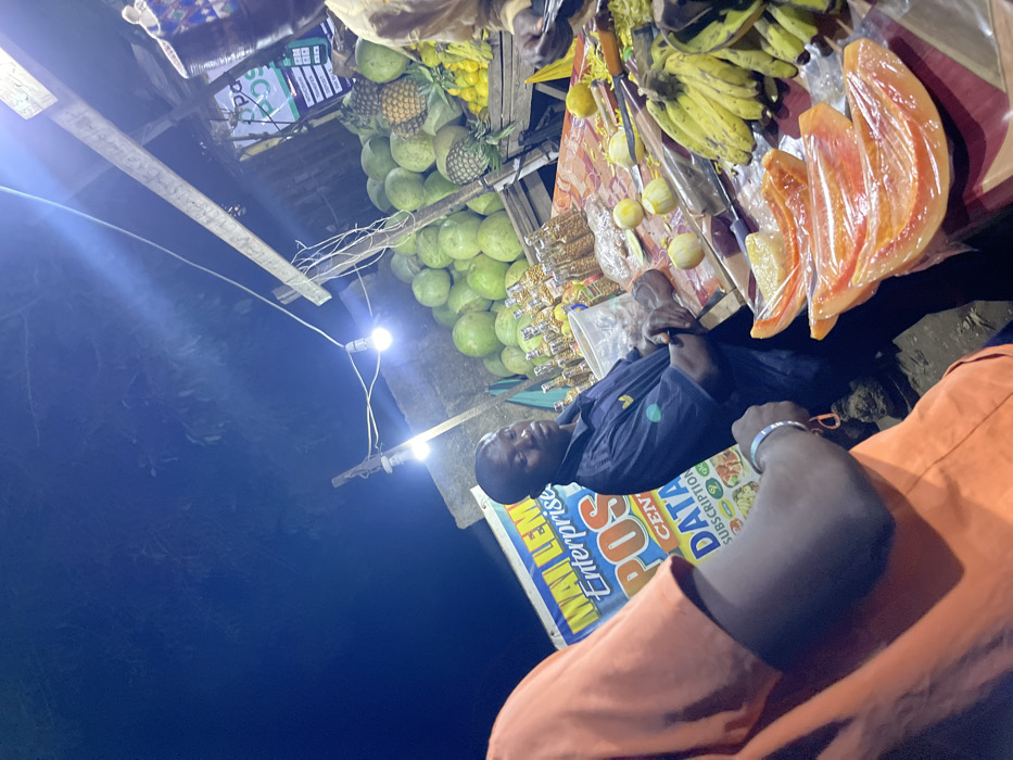 A fruit stand at night displays papayas, bananas, lemons, pineapples, and large melons. A man in a blue shirt sits by the stand. Another person, wearing an orange shirt, stands in the foreground. A sign advertises "Data Subscription." Two light bulbs provide illumination. The scene has a dark, nighttime ambiance.