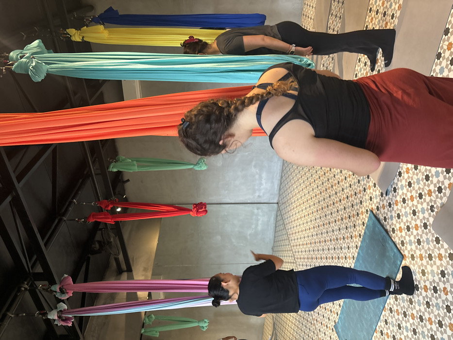 Several women participate in aerial yoga