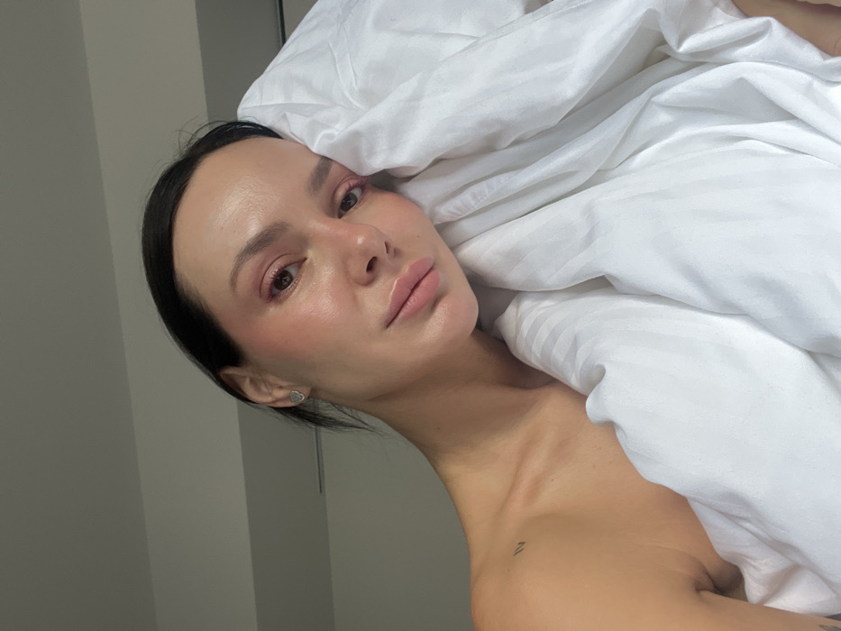 A woman with dark hair is partially covered in white bedding, looking directly at the camera. She wears makeup with pink eyeshadow and blush. A silver earring is visible on her left ear. Part of a light gray wall appears in the background. A small tattoo is noticeable on her right collarbone.