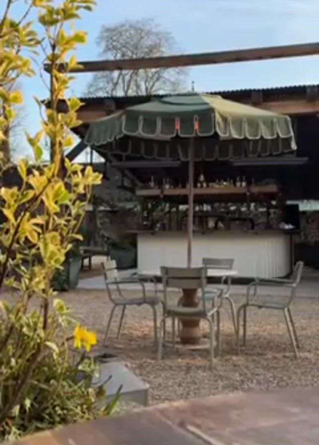 n outdoor seating area in a garden setting. A round table with four metal chairs sits under a green umbrella with a scalloped edge. The area is covered in gravel. In the background, there's a bar structure with shelves filled with bottles. A plant with yellow and green leaves is in the foreground. The sky is blue. There is no visible human presence.