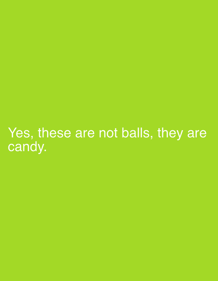 The image displays a solid lime green background. White sans-serif text is centrally aligned in the lower left quadrant, stating: "Yes, these are not balls, they are candy." No discernible physical location, environment, people, subjects, objects other than the text, actions, or interactions are visually present to identify a specific scene within the city of Capital City of Prague, Czechia.