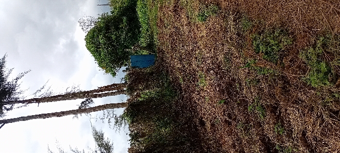 The image depicts an outdoor scene in Gatakaine, Kenya, under an overcast sky. The foreground consists of dry, brown ground cover mixed with sparse patches of green vegetation and exposed soil, suggesting recently disturbed or dry terrain. In the midground, a dense, overgrown hedge or natural barrier of green and brown foliage extends horizontally across the frame. Centered within this barrier is a narrow, vertical structure or gate, approximately two meters tall, painted a distinct blue color. This blue structure appears to be a passage point through the dense vegetation. The background features several tall, slender tree trunks with minimal upper foliage on the left, extending towards a light grey, cloudy sky. To the right, a large, rounded tree with dense green foliage is visible. No individuals, animals, or active interactions are present in the scene.