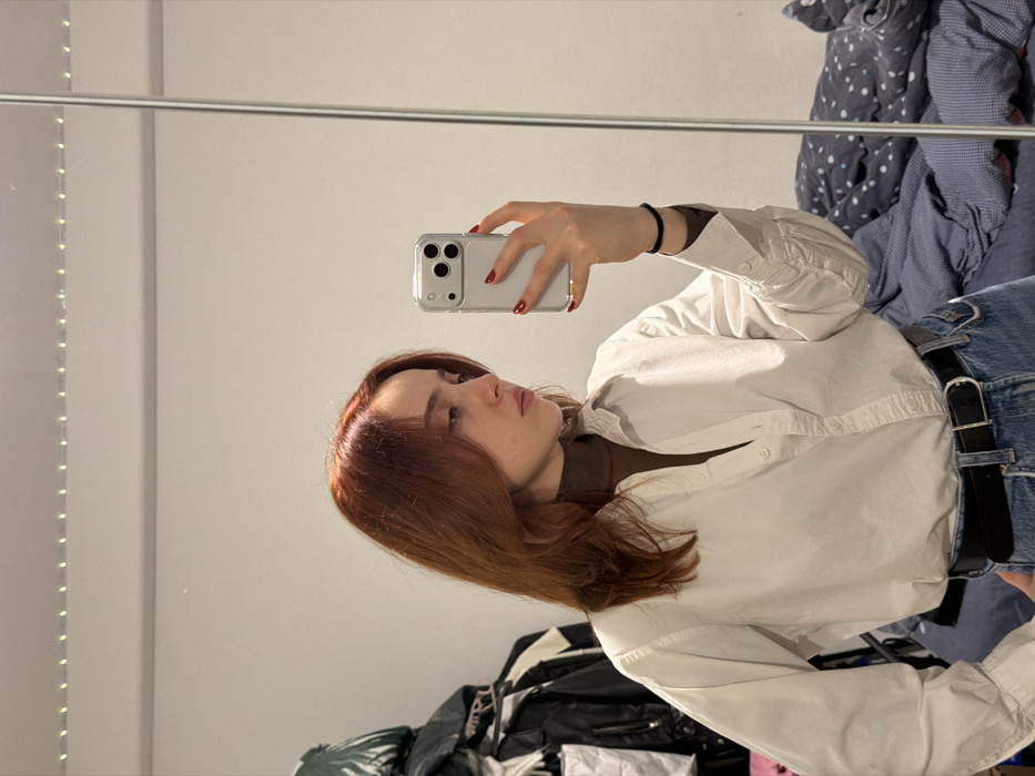 A young woman with auburn hair is taking a selfie in a mirror. She's wearing a brown turtleneck layered under a white button-up shirt and blue jeans with a black belt. Her phone has a clear case and her nails are painted red. The mirror shows a cluttered room with clothes piled on a bed and some hanging. A string of lights is visible to the side.