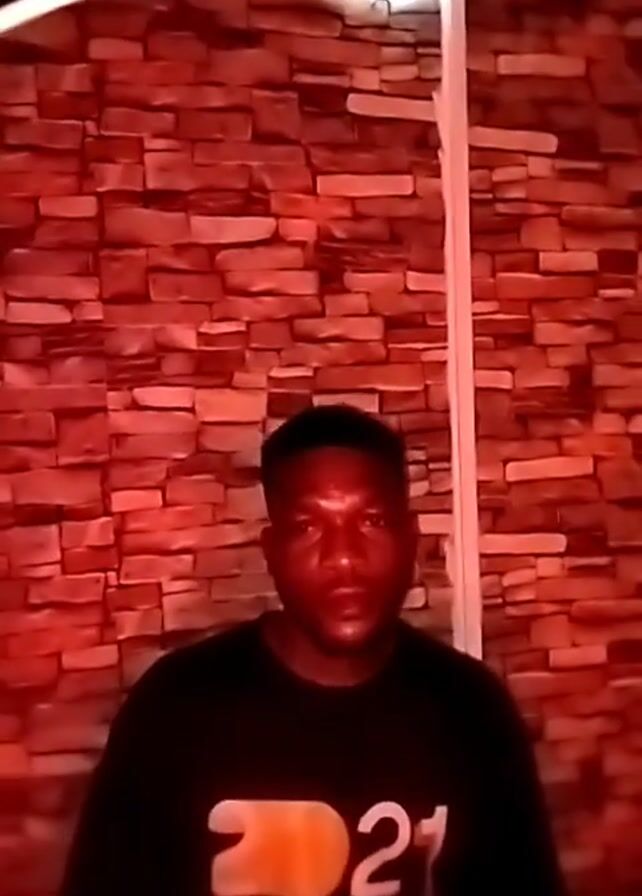A man stands in front of a red brick wall. He is wearing a black t-shirt with a white design on it. There is a bright light behind him. The man opens his mouth and sticks his tongue out. There's music playing in the background.