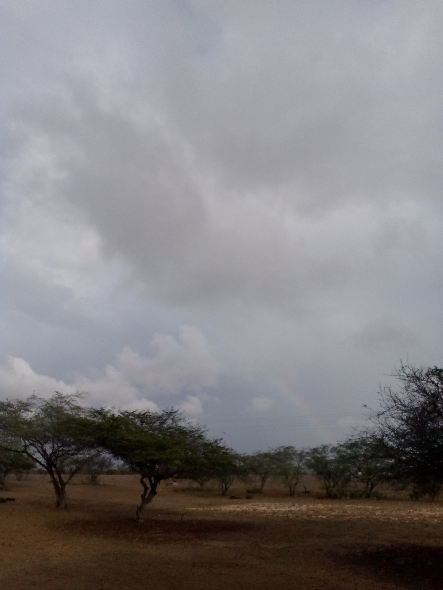 landscape with trees under a cloudy sky. A faint rainbow arc is visible in the sky behind the trees. The ground is dry and brown. The location is El Dátil, Venezuela.