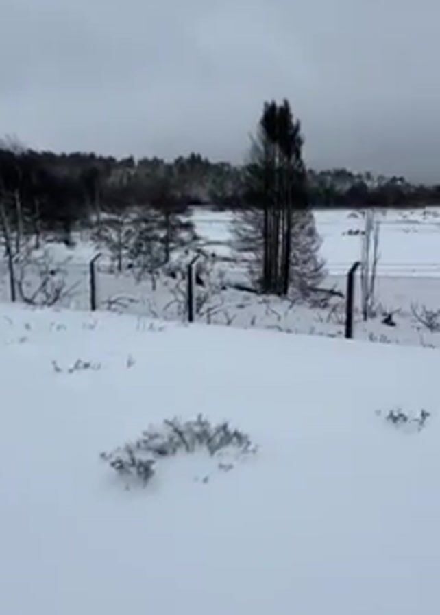 The camera pans across a snow-covered landscape on a gray, overcast day. In the foreground is a field of snow, with some sparse vegetation poking through. Beyond the field, there is a dark, sparse woodland with some burned or dead trees. A wire fence runs along the edge of the woods. In the distance, there appears to be a body of water, partially frozen. The sky is uniformly gray, indicating a cloudy day.