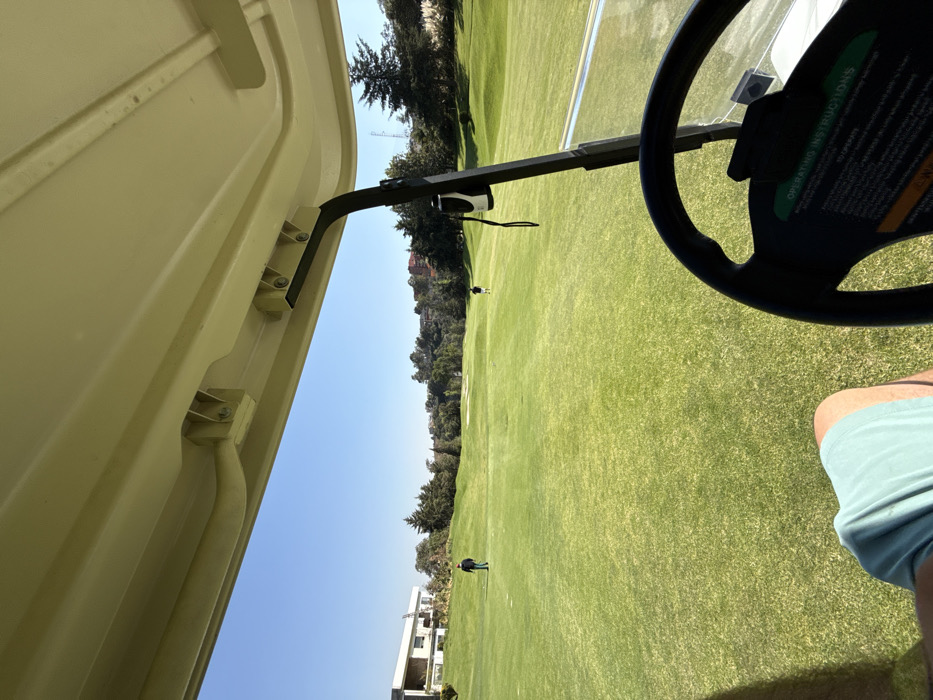 View from inside a golf cart on a sunny day. Lush green golf course stretches out, dotted with trees and a few distant figures. The cart's steering wheel occupies the right side of the frame, partially obscuring the view. A piece of the cart's roof is visible on the left, rendered in a light cream color. A leg clad in light blue shorts is also visible.