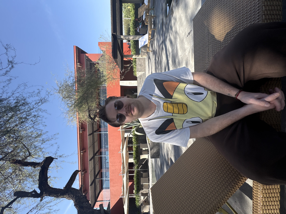 A man wearing sunglasses and a T-shirt with a cartoon duck design sits in a wicker chair. He has brown pants on and his hands are clasped in his lap. Behind him is a red building with a glass facade and a partially visible tree. The sky is clear blue. Additional chairs and tables can be seen on the patio area. The photo appears to be taken outdoors on a sunny day.