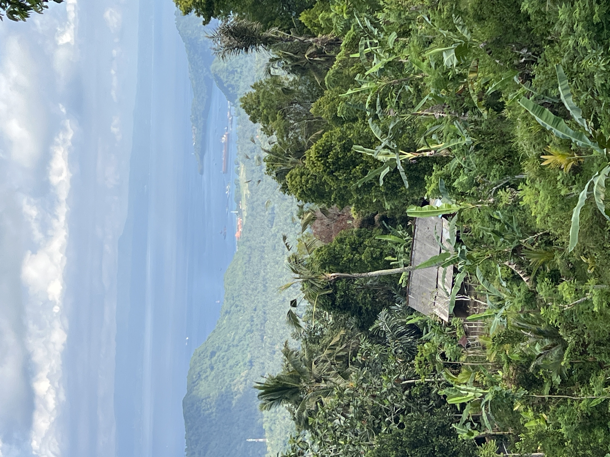 landscape overlooking the sea in Manggis, Indonesia. Lush green vegetation dominates the foreground, partially obscuring a small, simple structure with a corrugated metal roof. The background features a body of water, with hints of ships and coastal development visible along the shore. The sky is cloudy.