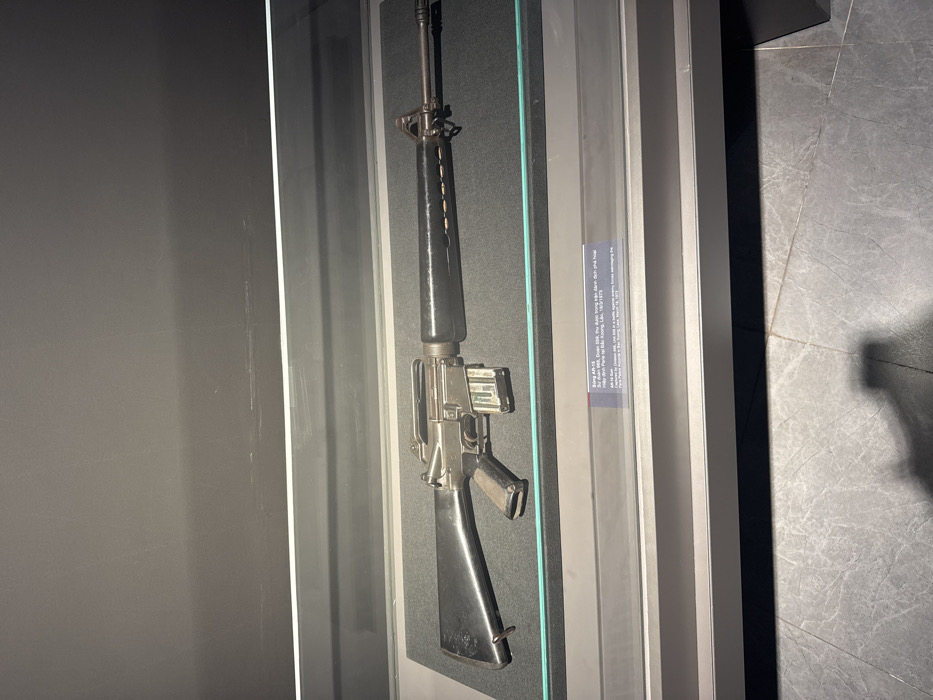 A black rifle encased in a glass display case. The rifle has a long barrel and a magazine attached to the side. A small, informational sign is visible next to the rifle. The case is situated against a dark grey wall. The floor beneath the display appears to be stone or tile.