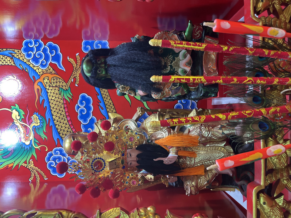 This image depicts a brightly lit religious shrine or altar located in Nathon, Thailand