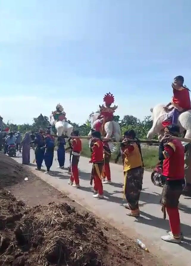 On a clear day, a procession is taking place on an asphalt road. Individuals dressed in red, gold, and blue are carrying large, white, figurative sculptures on their shoulders, using wooden poles for support. Each sculpture has a person seated on top. There are people dressed in plain clothing walking alongside the carriers. To the side of the road, a pile of dark earth or compost is visible. Motorcycles pass by the procession. In the background, trees and other greenery are visible. The scene suggests a cultural event or parade.